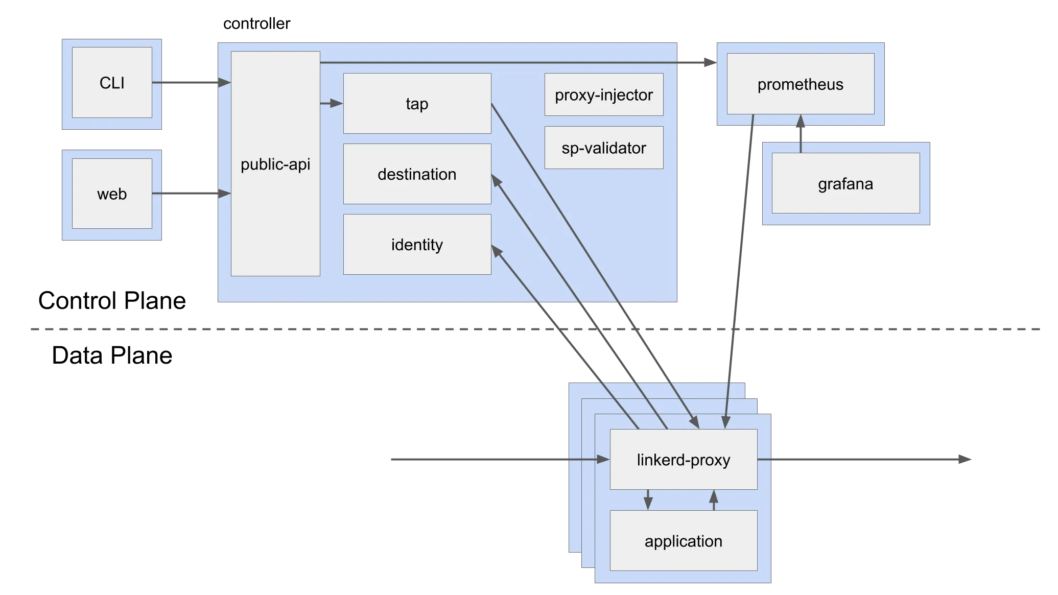 The destination component of the control plane looks for changes in configuration of linkerd (actualized as Kubernetes Custom Resource Definitions) and afterward pushes the right config for